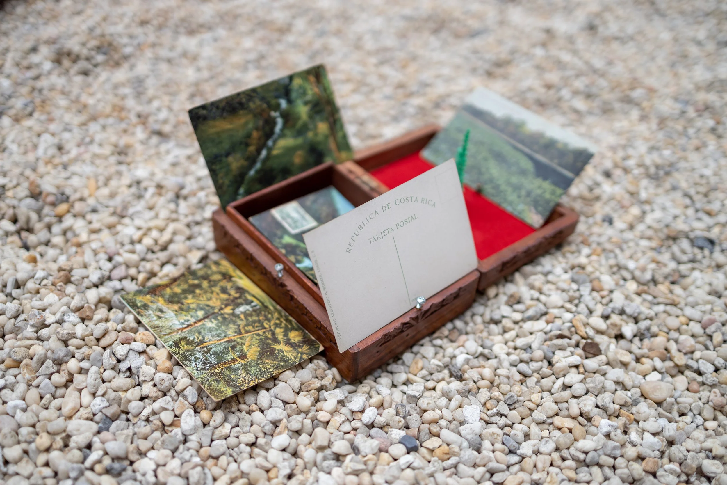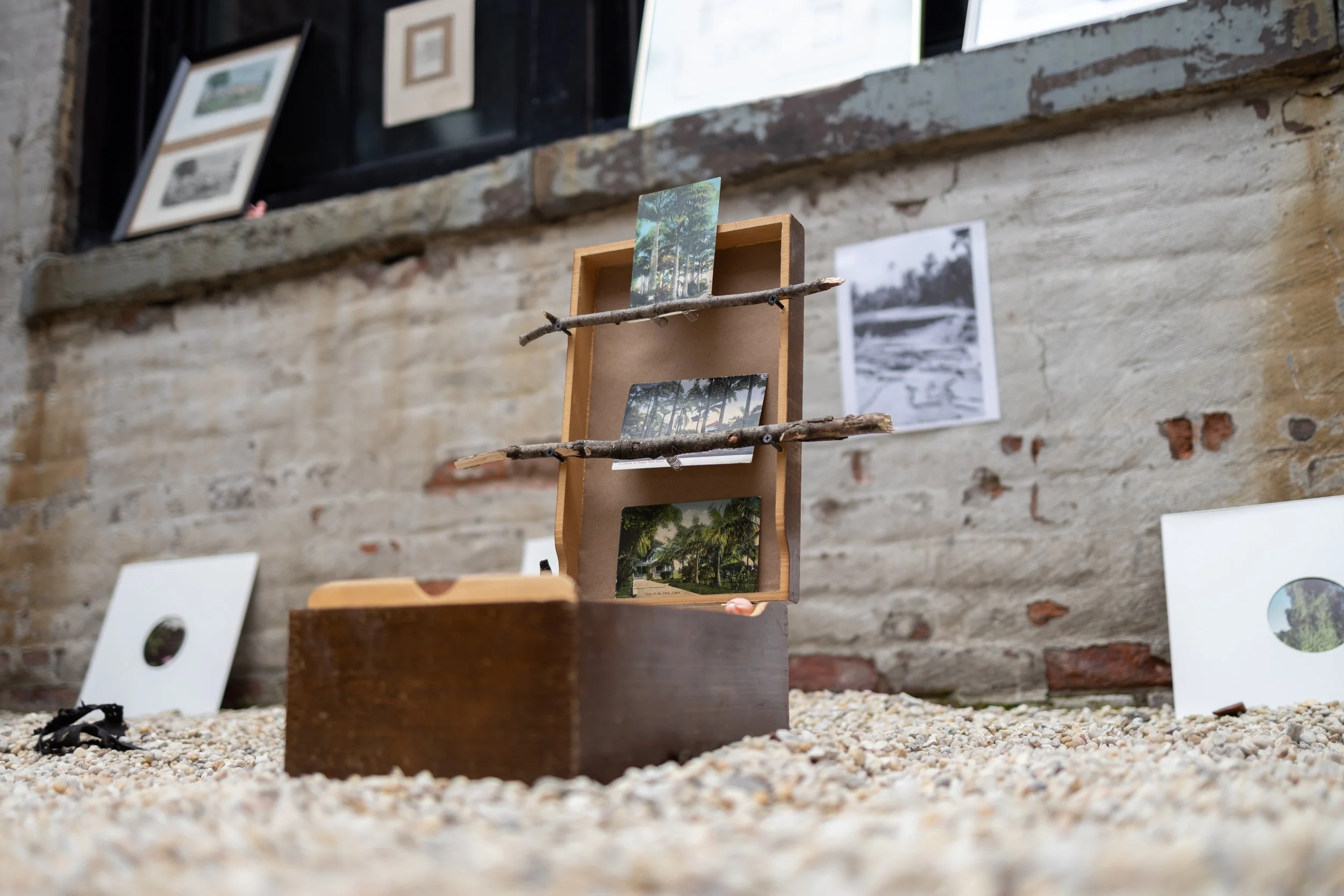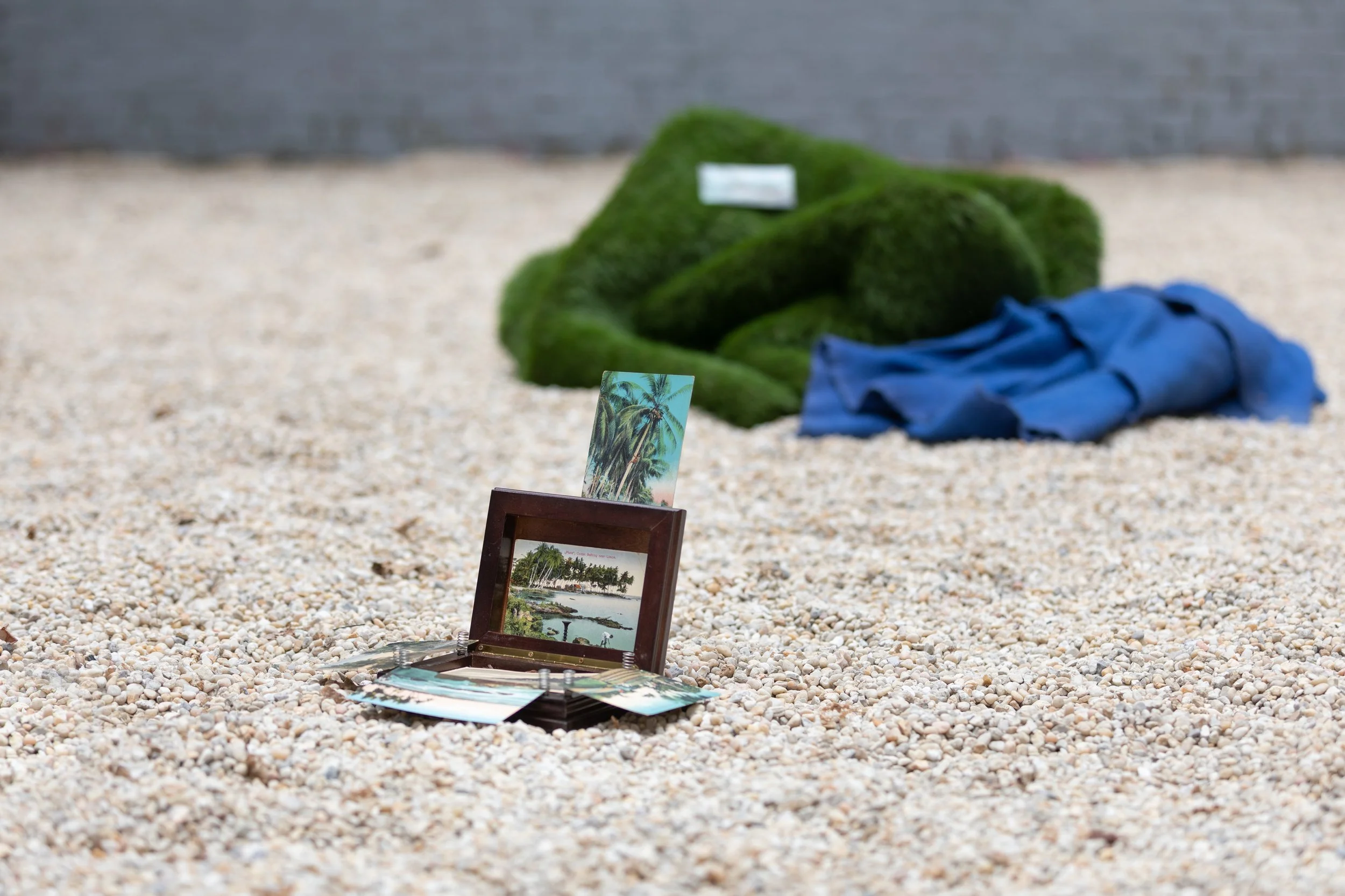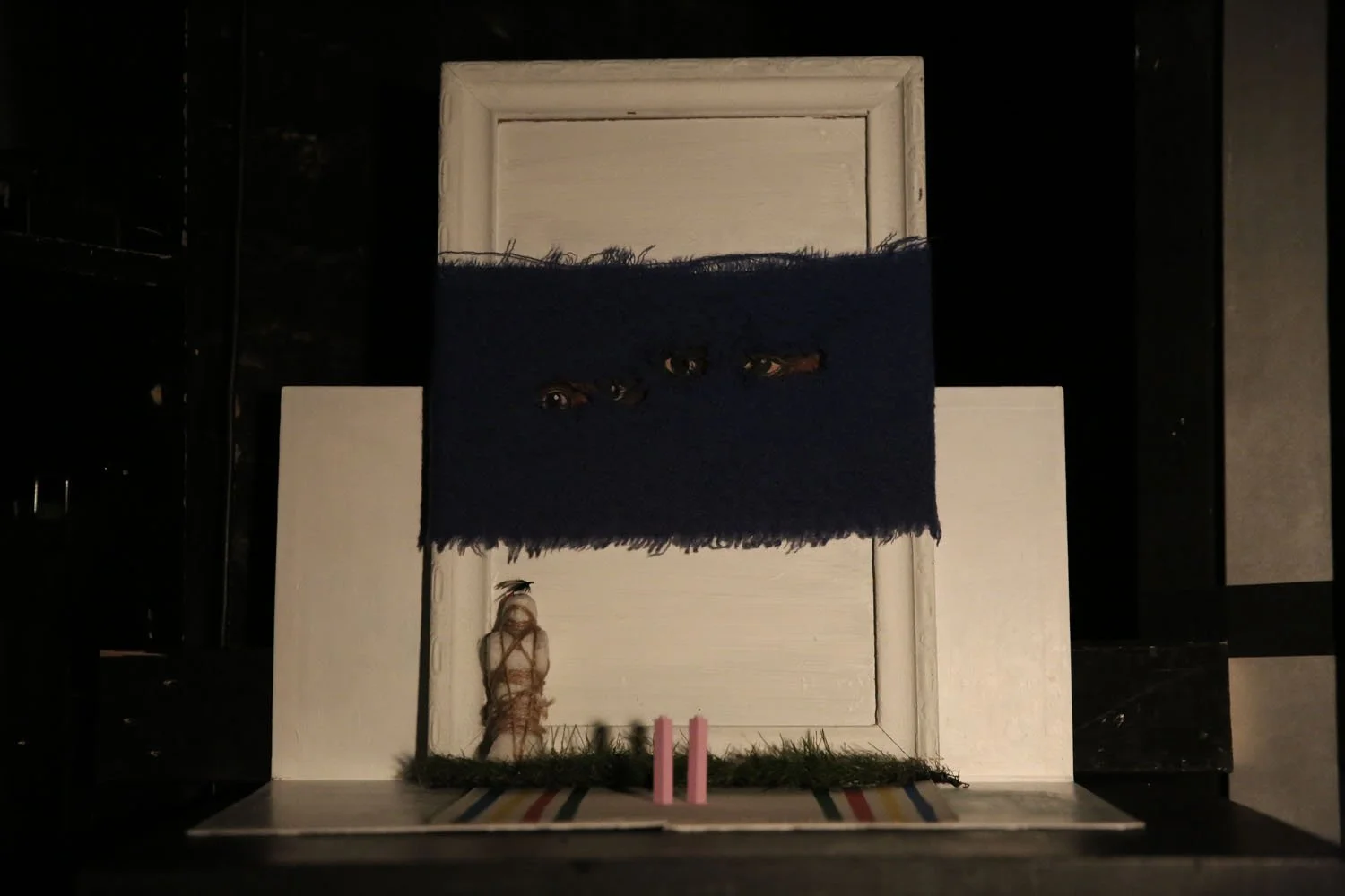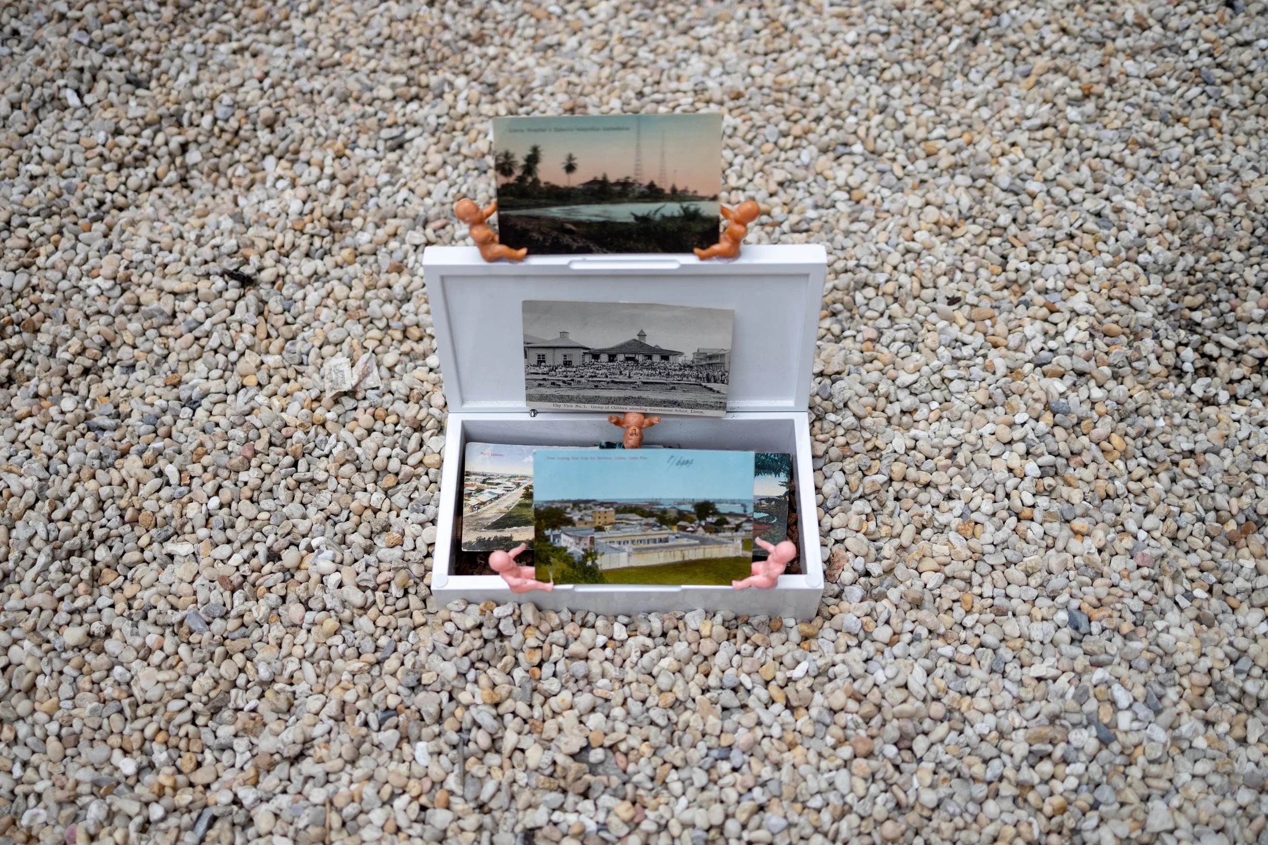 Materials: Wooden boxes, crucifixes, volcanic rock statues, plastic dolls, paper dolls, old postcards, botanical prints, fabrics, loose pages from the book Identity: Youth and Crisis by Erik H. Erikson, photographs, engineering drawings, books on botanical medicine, artificial turf, Lego pieces, fishing flies, wool blanket.