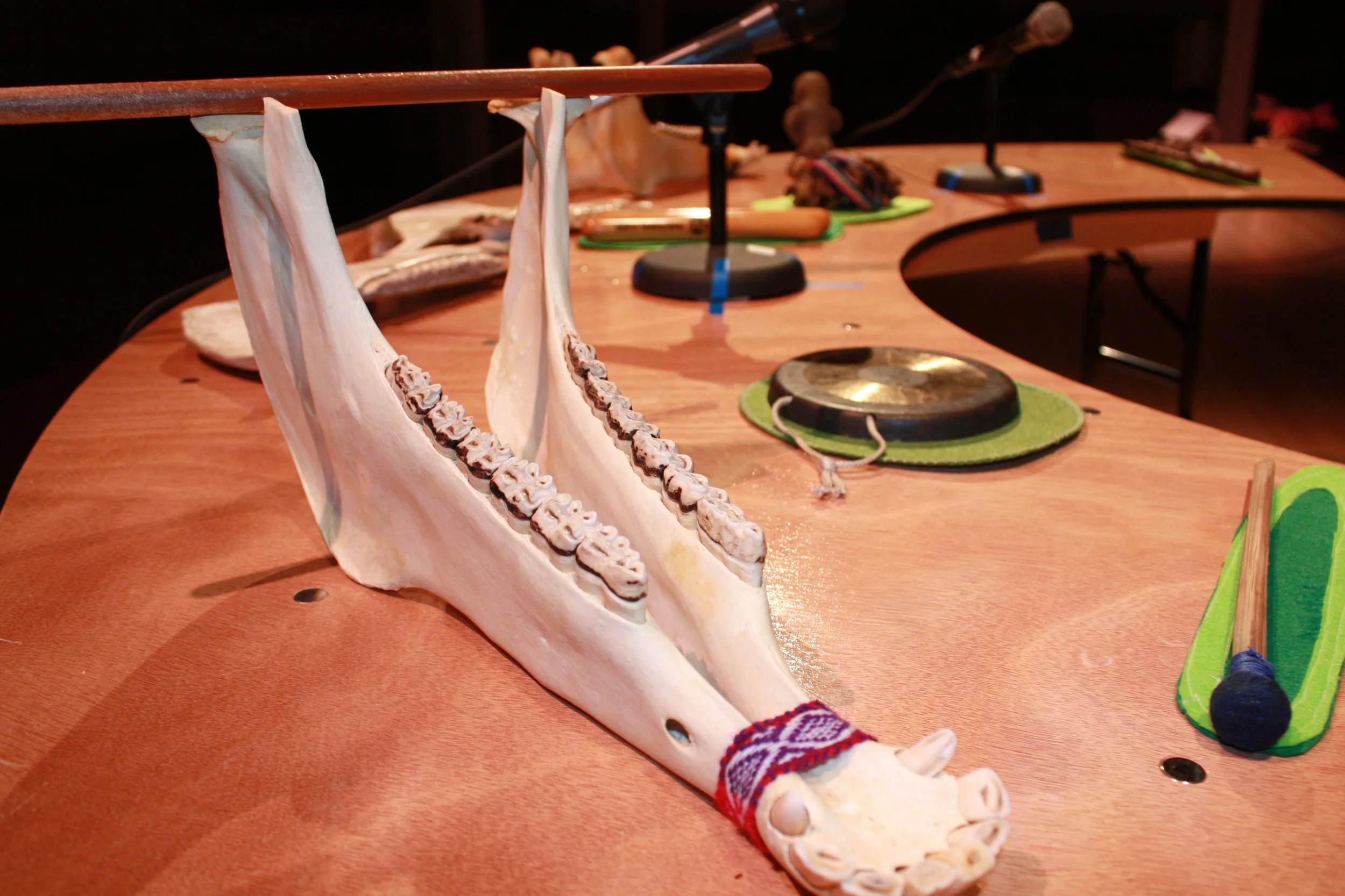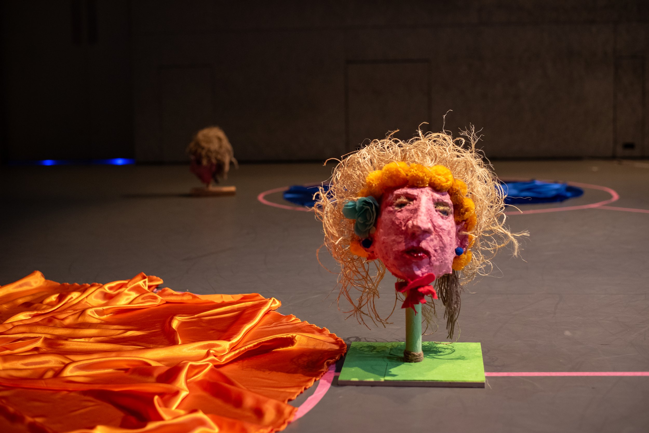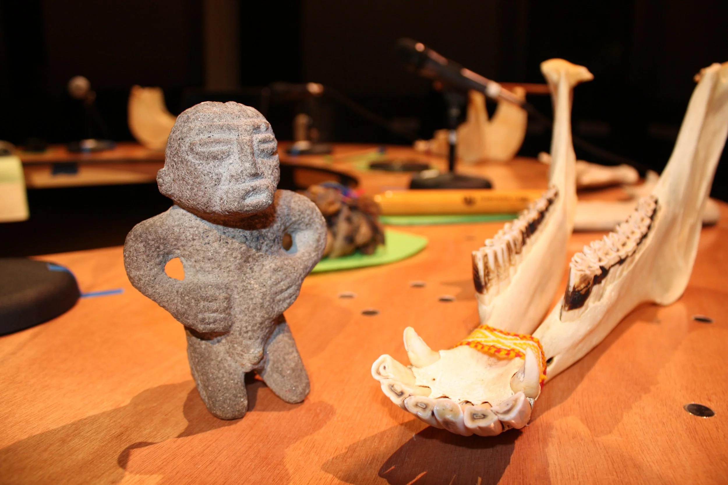 Materials: Paper mache masks, masking tape, wooden houses on wheels, indigenous statues made of volcanic rock, donkey jawbones, rope, anatomical drawing..
