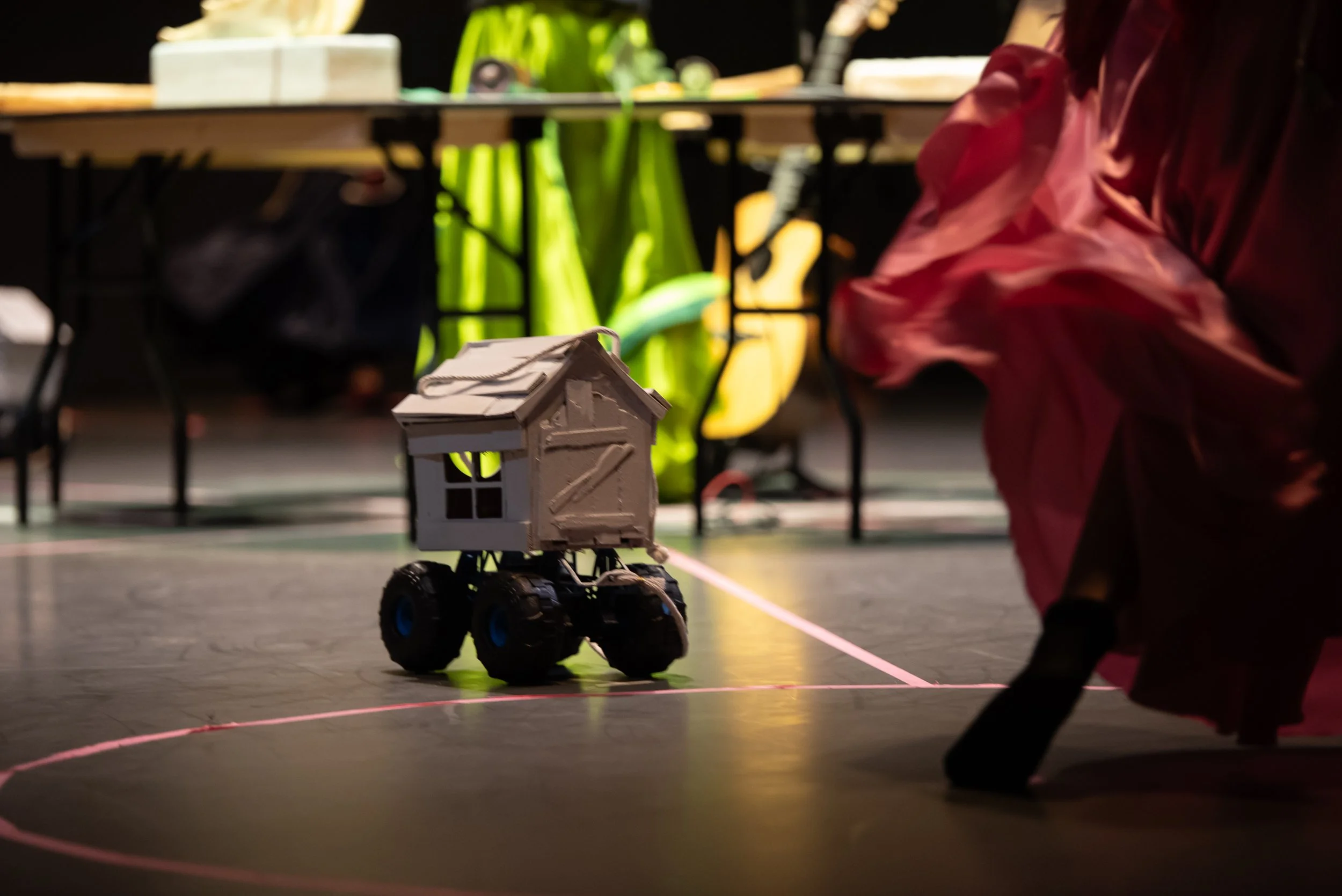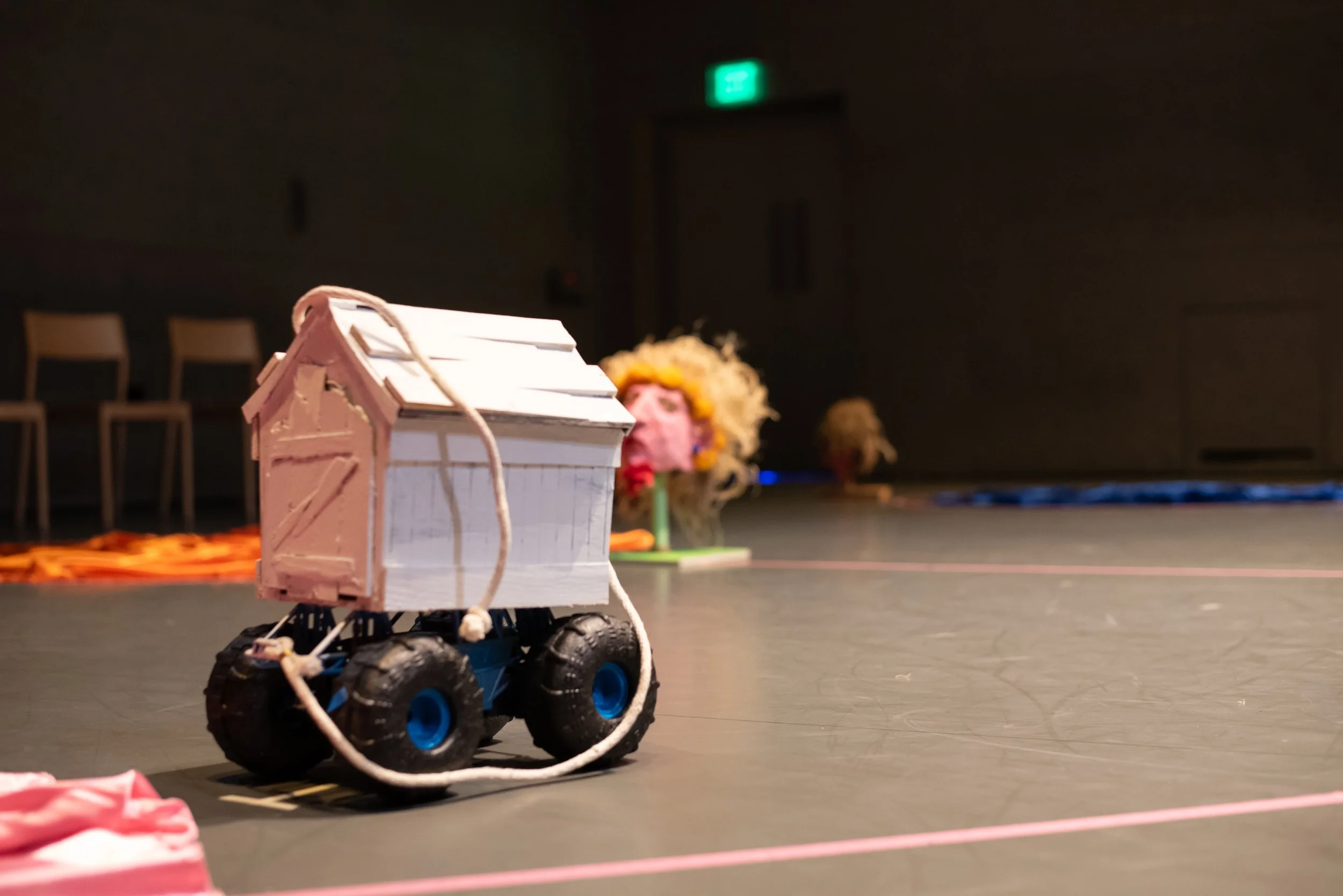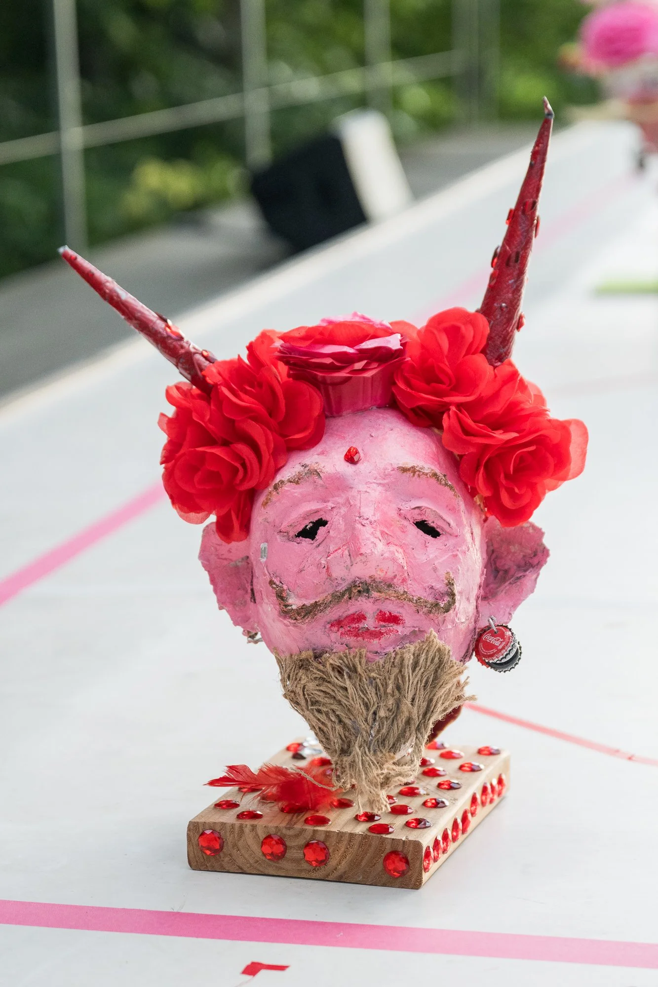 Materials: Paper mache masks, masking tape, wooden houses on wheels, indigenous statues made of volcanic rock, donkey jawbones, rope, anatomical drawing..