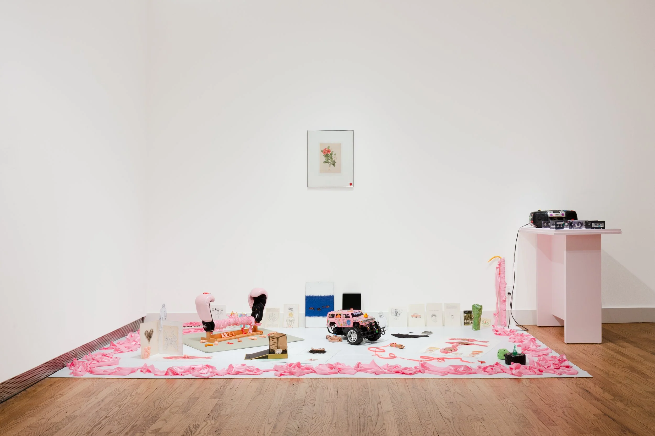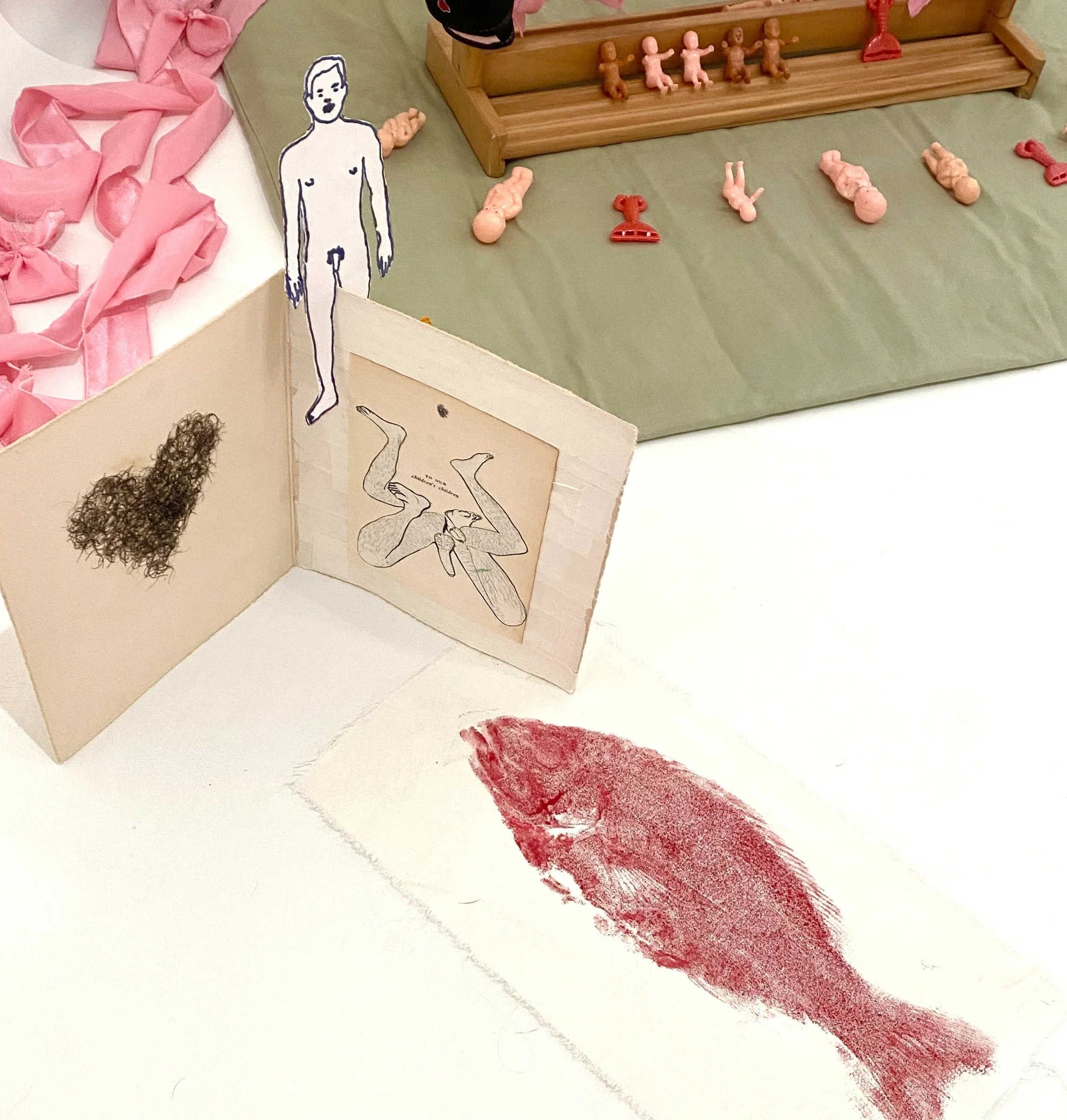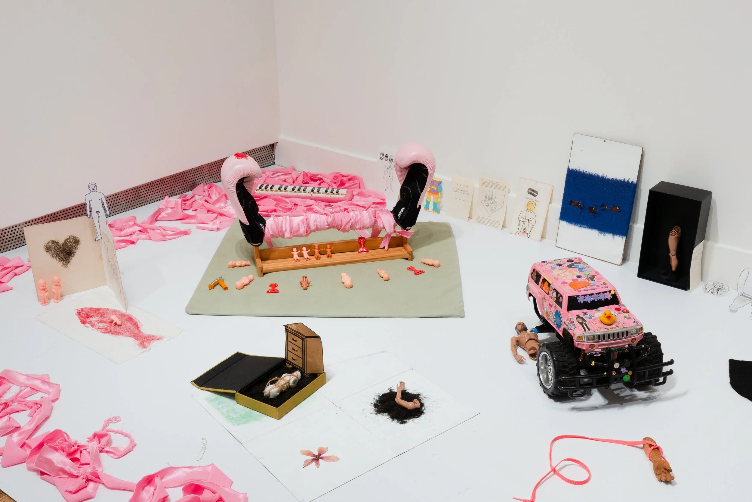 Materials: Boxing gloves, plastic dolls, paper dolls, plastic toys, gyotaku prints, melodica, pressed flowers, botanical prints, cardboard boxes, remote-control car, paper drawings, carved wooden hands, loose pages from the book Identity: Youth and Crisis by Erik H. Erikson, laces, paper drawings and collage, satin fabric, vintage postcards, cassettes, boombox, human hair.