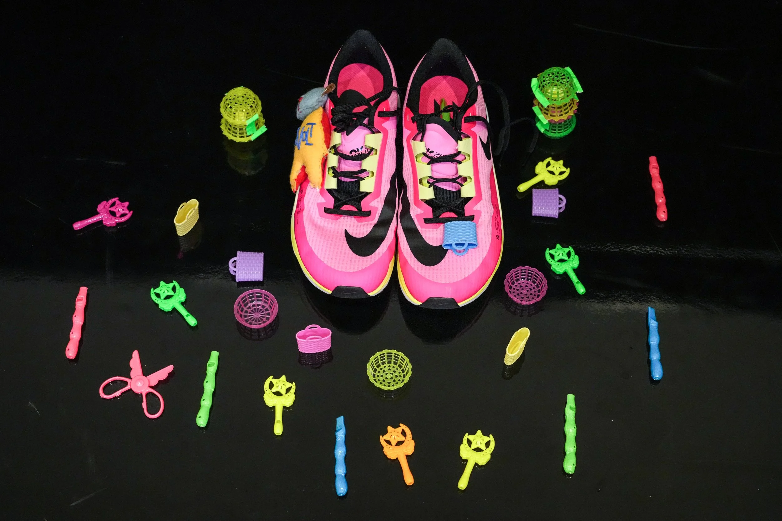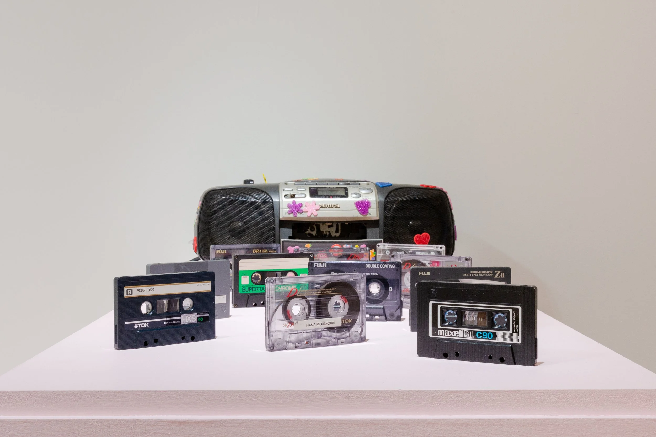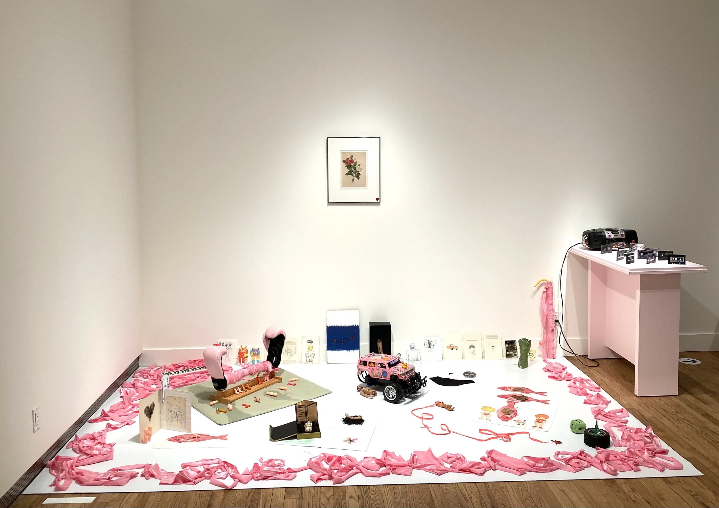 Materials: Boxing gloves, plastic dolls, paper dolls, plastic toys, gyotaku prints, melodica, pressed flowers, botanical prints, cardboard boxes, remote-control car, paper drawings, carved wooden hands, loose pages from the book Identity: Youth and Crisis by Erik H. Erikson, laces, paper drawings and collage, satin fabric, vintage postcards, cassettes, boombox, human hair.